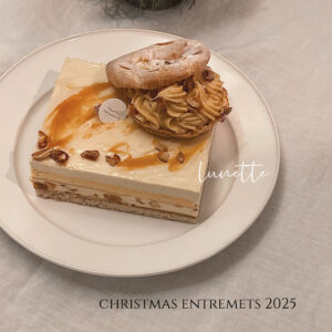 和栗クリーム、シャンティショコラドゥルヤ、クレームパティシエール、マカダミアナッツのキャラメリゼ、アーモンドメレンゲの構成になります。