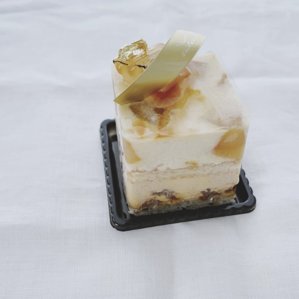 和栗クリーム、シャンティショコラドゥルヤ、クレームパティシエール、マカダミアナッツのキャラメリゼ、アーモンドメレンゲの構成になります。時間が経つと風味が変わってくので是非お早めにお召し上がりください