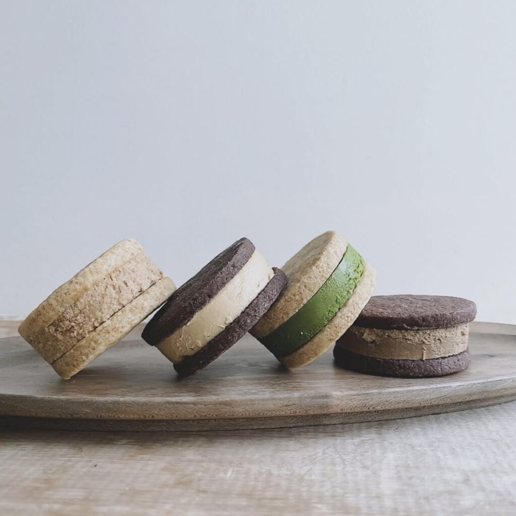 また、チャイにはウーフさんのアッサムを使用しシナモン、カルダモン、ジンジャーなど7種類のスパイスを配合、抹茶には宇治抹茶のパウダーと八女抹茶のペーストを使用し黒糖のシロップを合わせることでコクを出し、こちらはそれぞれの味をダイレクトに味わえるよう全粒粉のプレーンのクッキーでサンドしました。合わせるクッキーや砂糖の種類、スパイスの配合など何度も試作し完成しました。